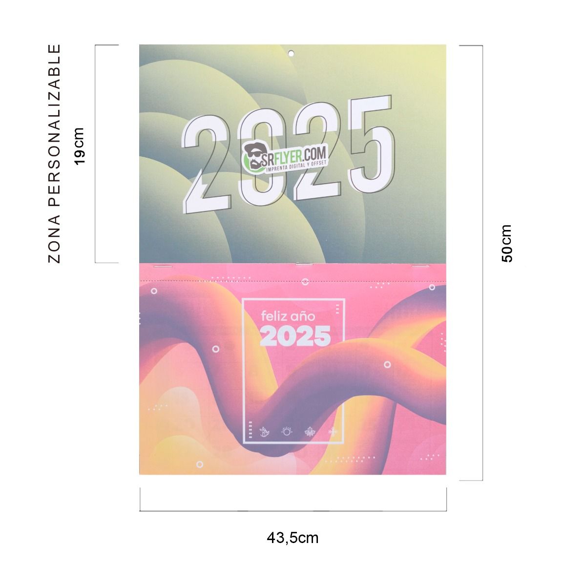 Ofrecemos tamaños estándar como 33,5 cm y 43,5 cm de alto, con opción de faldilla mensual + zona superior personalizable. También podemos trabajar formatos especiales bajo pedido.