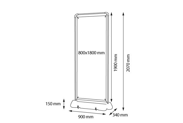 Dimensiones del soporte: aprox. Alto ~2070 mm, Ancho ~900 mm, Profundidad ~340 mm